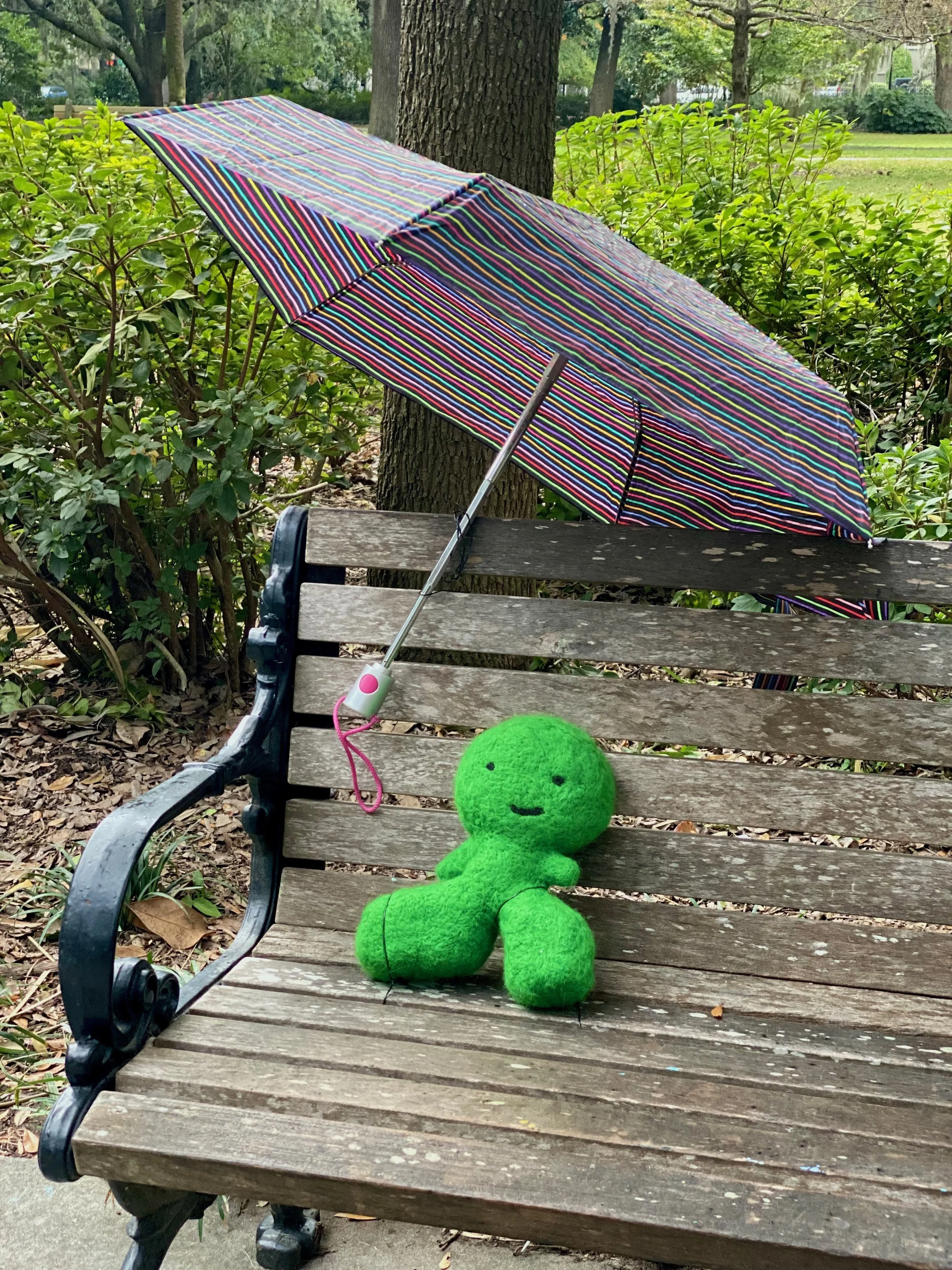 "Shmergle on bench with umbrella and friend," 2022 Felted wool, umbrella, friend