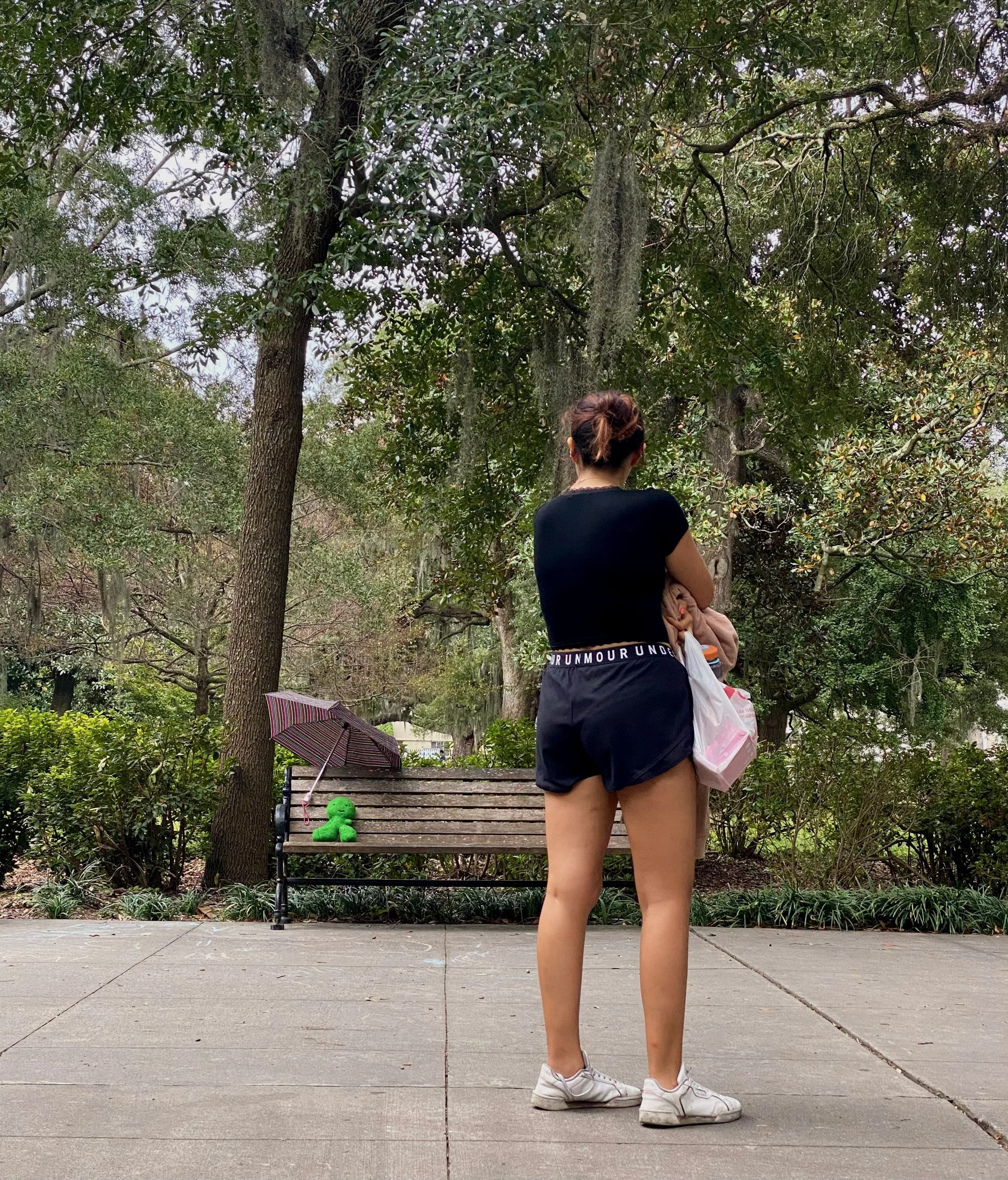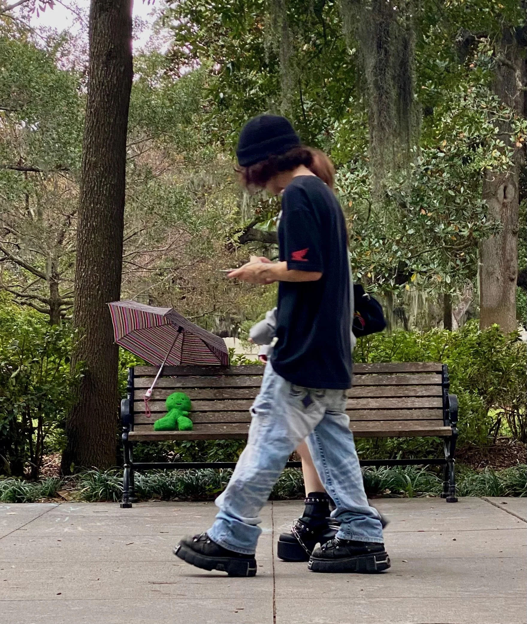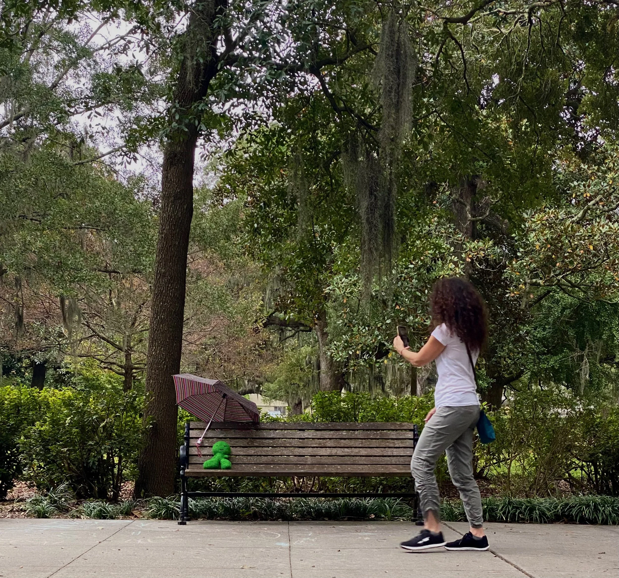 "Shmergle on bench with umbrella," 2022 Felted wool, bench, park