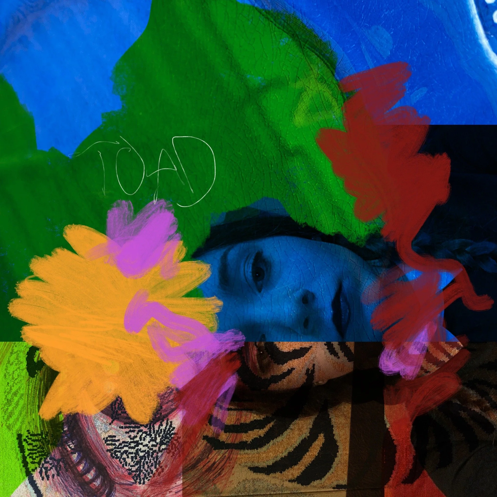 "Toad," 2022 Digital Collage. Pictures of friend dressed a Wednesday Addams with plastic plate and word Toad.